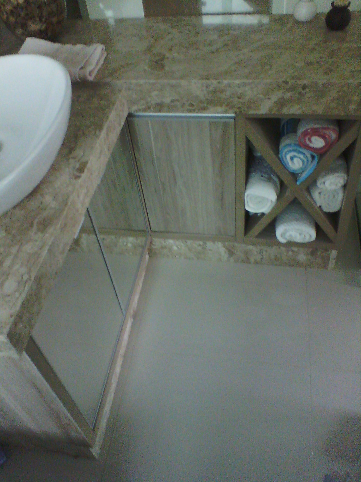 Aparador com portas de abrir com fecho toque, tampo em formato de C com engrossamento em madeira